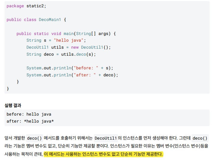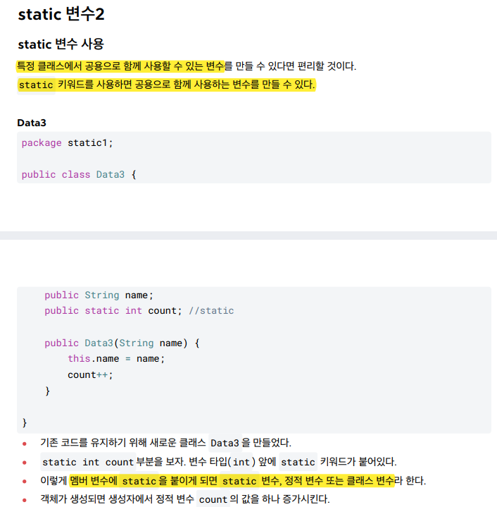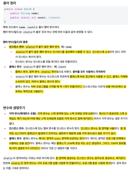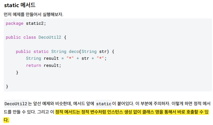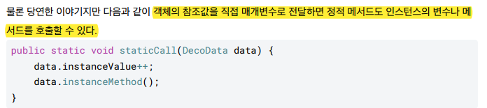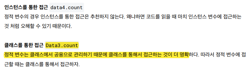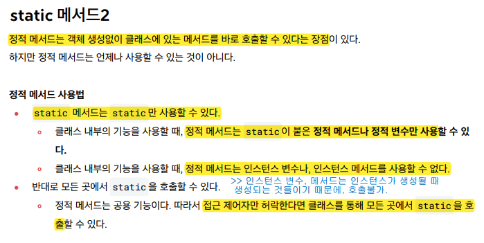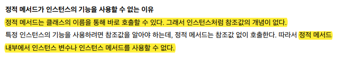 * 특정 인스턴스의 기능을 사용하려면 참조값을 알아야하는데, 정적 메서드는 참조값 없이 호출한다. 따라서 정적 메서드 내부에서 인스턴스 변수나 인스턴스 메서드를 사용할 수 없다 !
