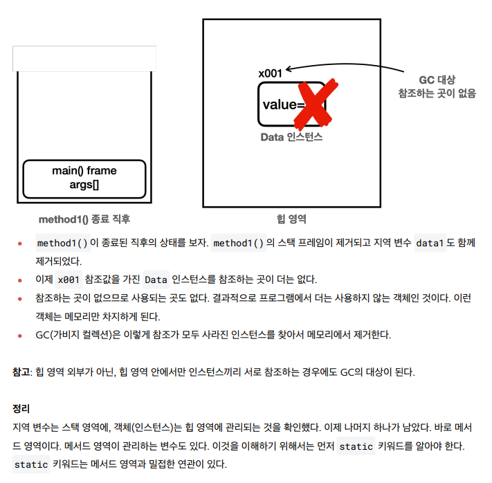 * static 메서드는 붕어빵틀(class영역) 에서 관리되기 때문에, 인스턴스영역에 있는 인스턴스 메서드를 호출해서 사용할 수 없다 !